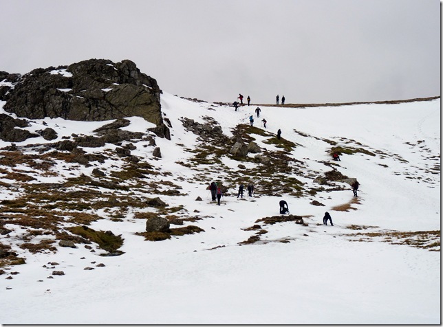The weather played a key part in this walk, Great End was Tim’s pinnacle fell & as long as we made the summit that’s all that mattered. The snow & freezing temperatures that Lakeland has experienced over the past few months was gradually thawing which meant anything that did thaw out refroze, so there was less snow but dangerous ice packs, I took my new crampons with me eager to try them out but they stayed firmly in my pack until the ascent on Calf Cove from Esk Hause, the scene could have come right out of a comic book, hikers gathered in there units slowly itching up the 60 metre slope, the snow here hadn’t melted & was compact (a vertical ice rink comes to mind) it was here I slipped on the Crampons & made my way up to the top of Calf Cove, as you can see from the photos alot of snow has disappeared and what seemed to be a more familiar site with other walkers were the Micro spikes, could Scafell be summated using these? the answer was yes, droves of walkers had them & I saw no struggle at all, but for me I’ll stick to the crampons. |