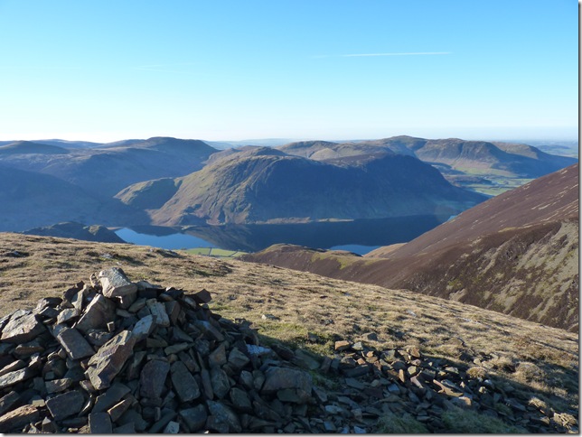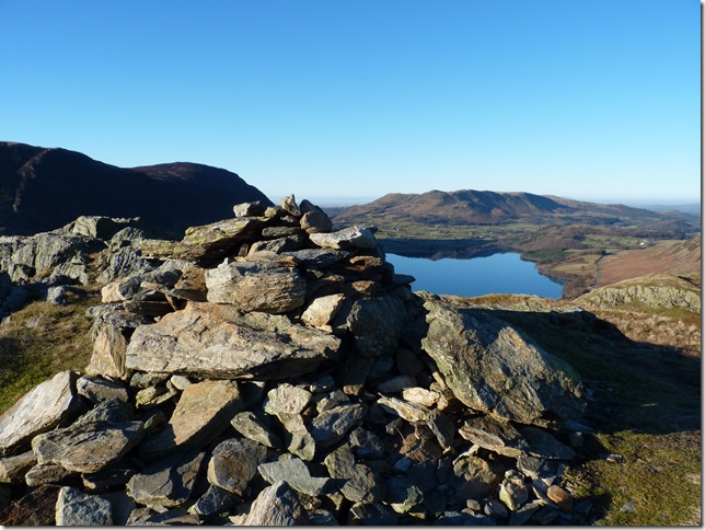Rannerdale Knotts summit cairn with Crummock Water & Lorton Vale. |