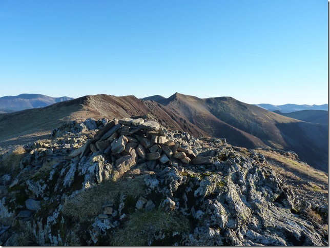 Whiteside summit cairn with my ridge route ahead, the prominent peak centre is my next destination Hopegill Head, to the left of Hopegill Head is Grisedale Pike & to the right Sandhill leading down to Coledale Hause, its time to put the hard graft behind me for a while & enjoy the ridge walk. |
