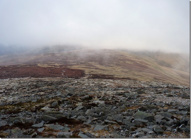 Round Knott from my descent off Carrock Fell, & somewhere in the cloud towards the right is my next target High Pike, but first there was quite a bit of bog to negotiate. |