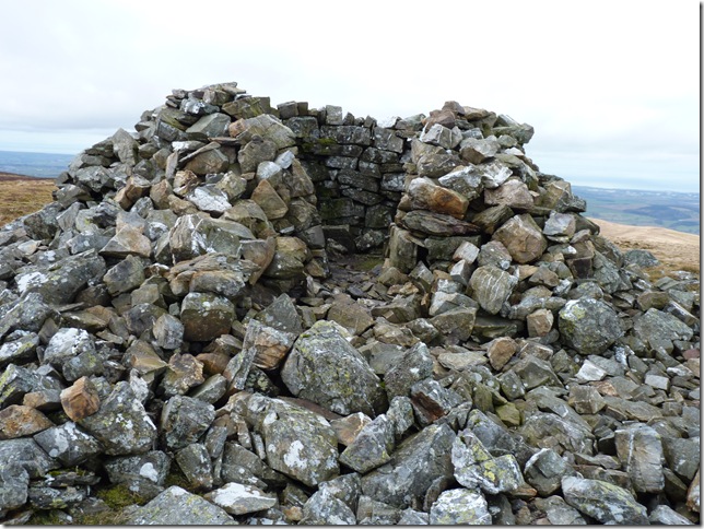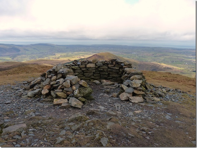 Blake Fell summit shelter with Knock Murton looking considerably smaller by now, I yearned for a cup of coffee & maybe a respite from the wind but I decided to press on until I got to my next fell top, Carling Knott. |