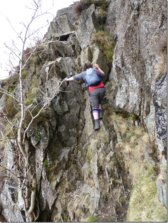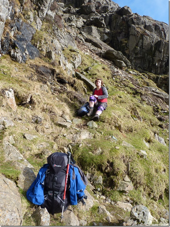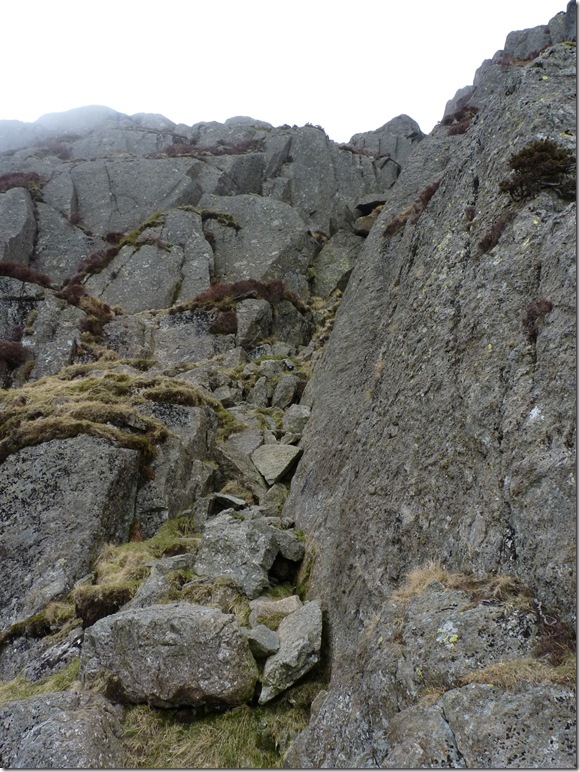 Checking out Jack’s Rake : A little daunted as I look up, prospects of the climb ahead gave me the choice to layer down, my jacket was tucked into the lid of my pack & my camera bag was fastened to the lid strap from about half way up. In all preparation for today I had chosen to use my Berghaus 22 Ltr pack only to find the reason why I don’t use it anymore was because the stern strap had somehow been lost, so I had no choice but to use my Berghaus Arete 45 Ltr pack with only the essentials packed, notice how tight the side straps are fastened with only my hydration pack gaining most weight, this was the best way to get around not having a lighter pack. |