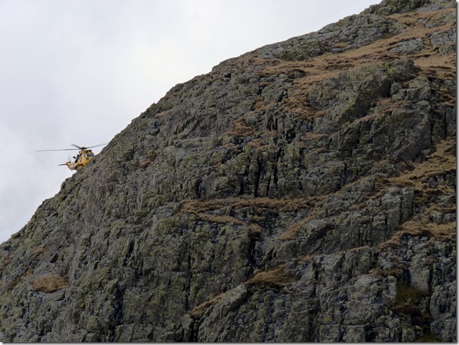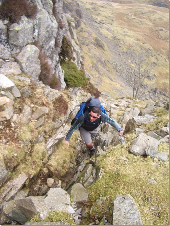 One of many ‘chimneys’ situated along the Rake, how the hell I got my 14 stone bulk up & through a two foot wide gap is beyond me. A group had caught up with us & waited patently for me to gain the top, only one of the group followed me, the rest went around as Tim did, here I let them pass as I held firm, two hands gripped to the top of the chimney & two calf’s shaking perched precariuosly with my boots on not more than an inch of rock each side, I waited for the group to pass & as Wainwright wrote, used my knees, my back my arse to get to the top, Tim smiled & noted ‘Paul your f-in calf’s were burning, I could see them shaking & popping out! This two/ three minute moment took a huge amount out of my reserves. |