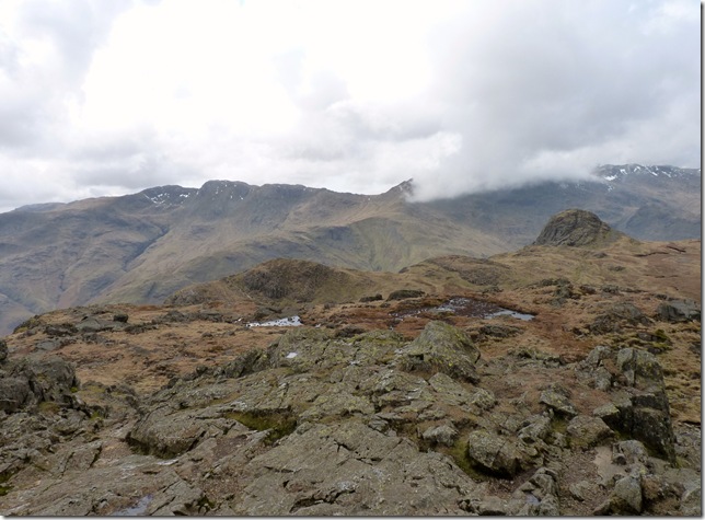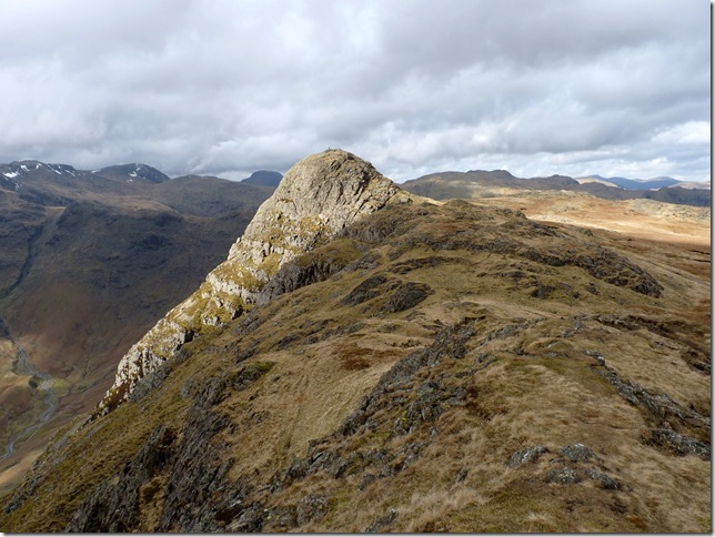 Our next two targets, Loft Crag & Pike Of Stickle with Crinkle Crags to the left, The Band centre & Bow Fell’s summit under cloud. |