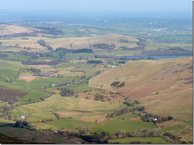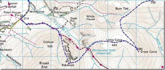 Great views as I leave Bakestall & head down Birkett Edge, The Cumbrian Way cuts right through the valley but today I am heading for Great Calva to the right, the fell closer to the camera is Little Calva, Lower Left is the depression of Dash Falls. |