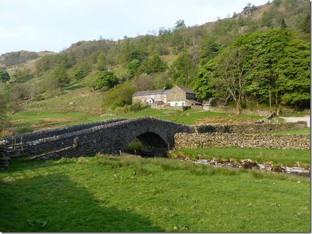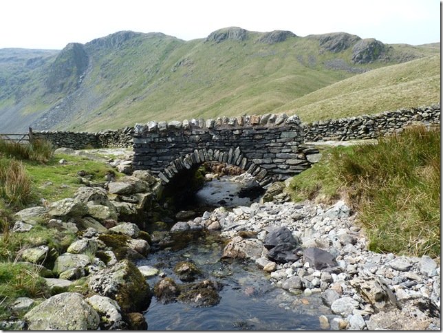Crossing Gatescarth Beck over this tiny pack horse bridge, with Raven Crag in the background. |