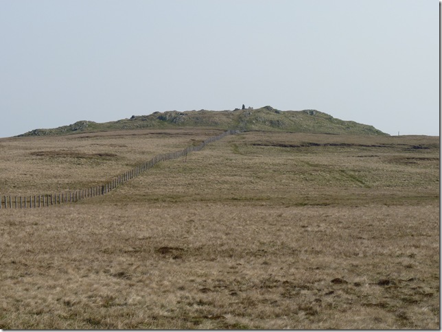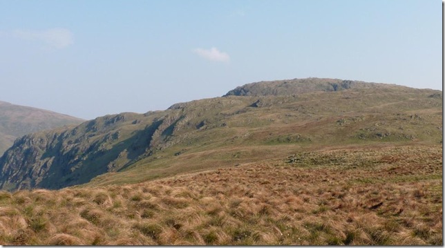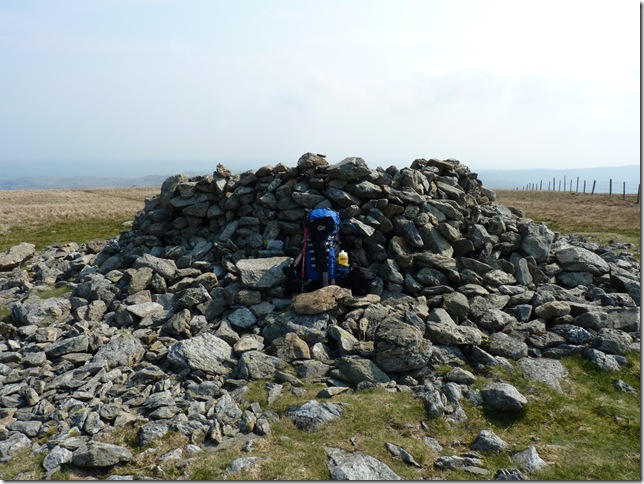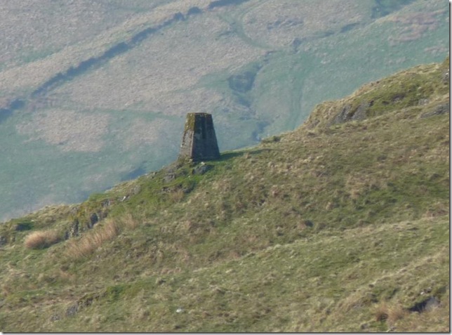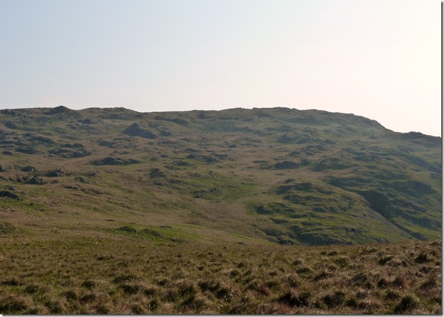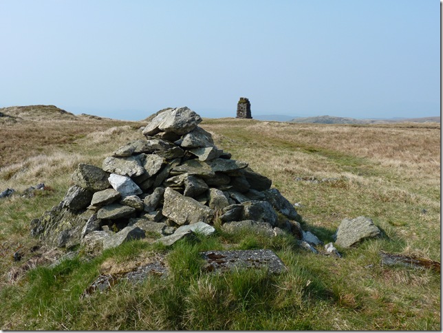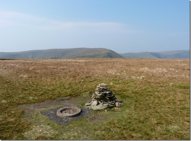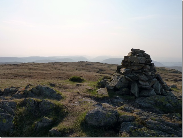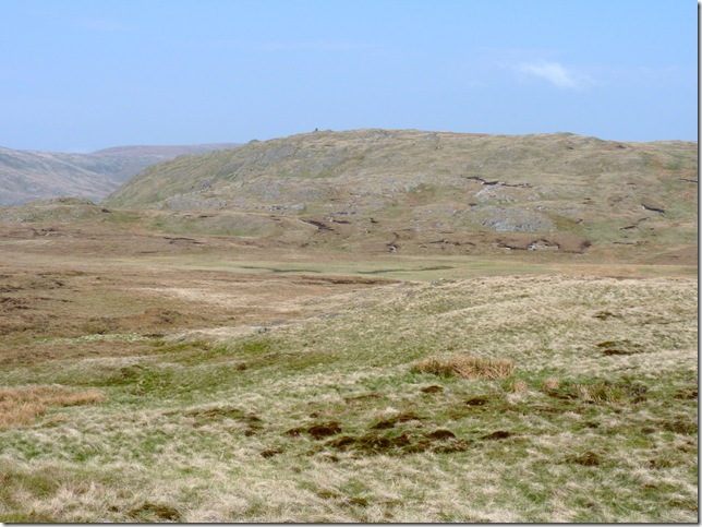 From my ascent of Grey Crags I spot the Survey Pillar on the southern flanks of Great How, now much too far away to retrace my steps. |