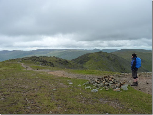 Fairfield summit cross shelter with Tim looking towards St Sunday Crag. |