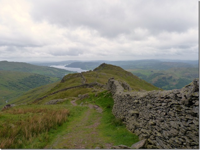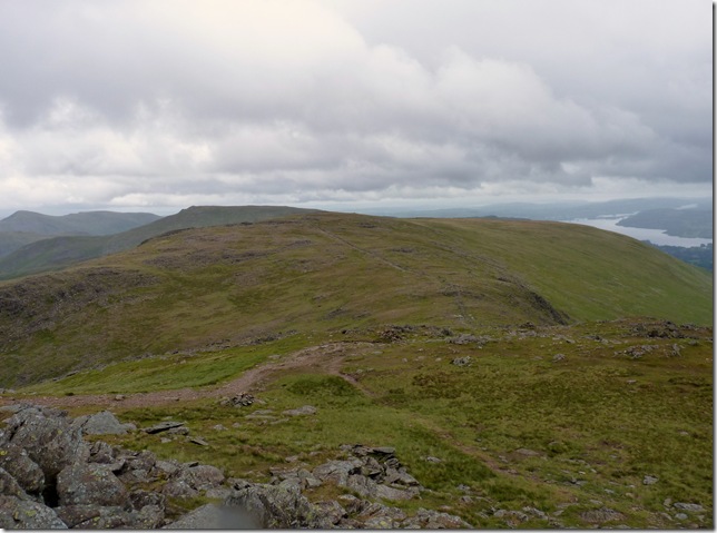 From Heron Pike summit you get the wonderful view of the ridge walk ahead, with Rydal Fell forming most of this smooth grassy ridge Great Rigg is the fell visible still yet not under cloud Fairfield however is not so lucky, but things have time to change with the strength of this wind. |