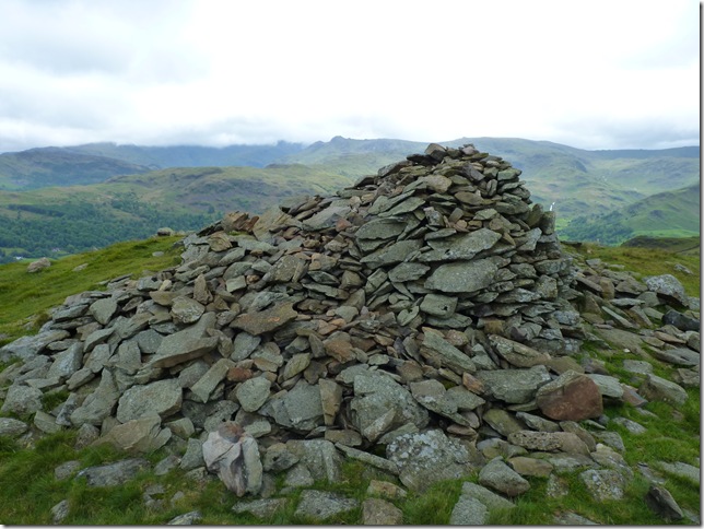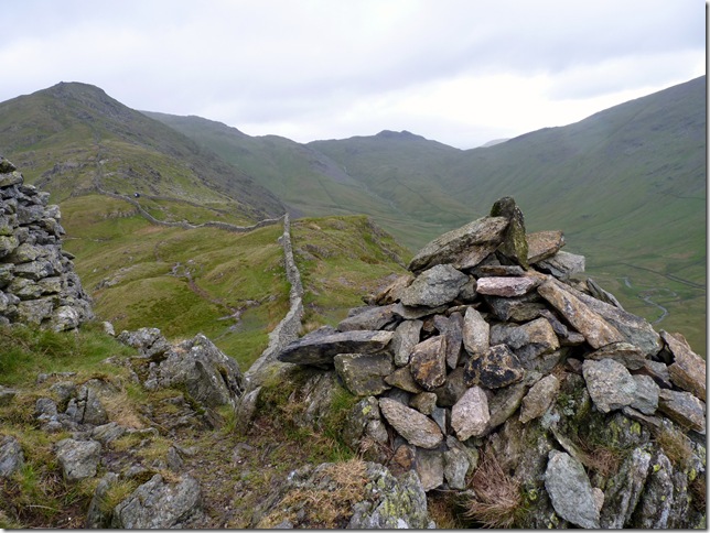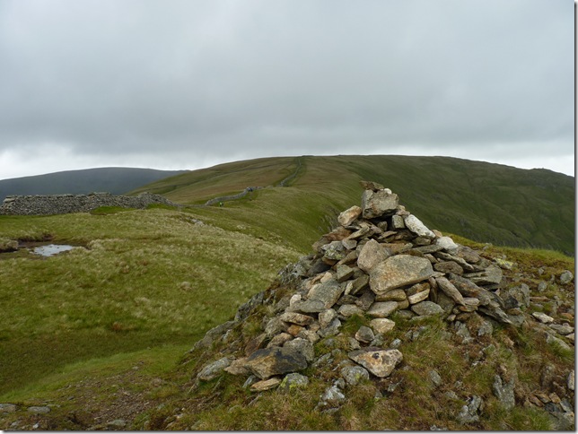 High Pike summit cairn looking back up towards Dove Crag & the wall we used as a windbreak. |