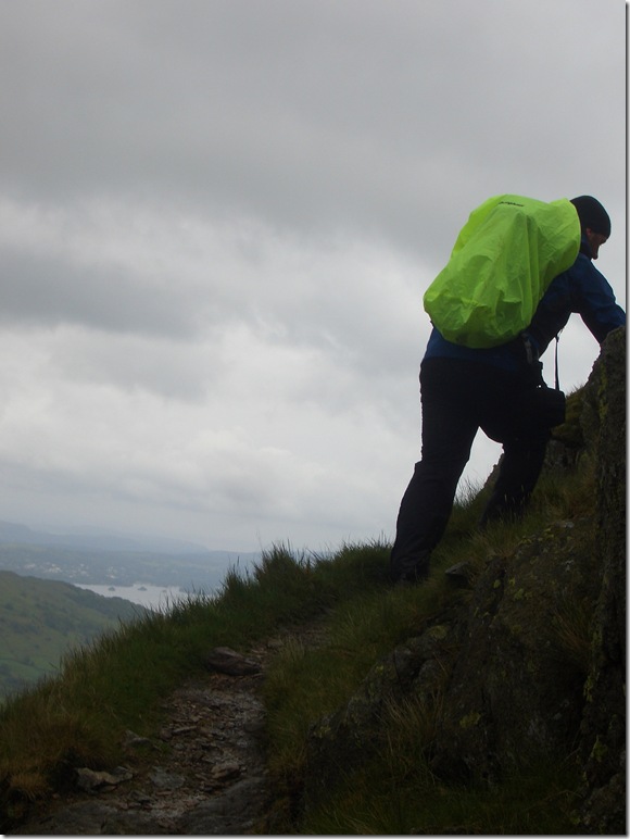 Oh dear, I’ or (we) are not used to sitting in the car with the windscreen misting up, the wipers going like the clappers, the rear demister turned on, here looking like two lovers on lovers lane all fogged up ‘hey stop staring where waiting for the rain to stop’ going through my mind, but there was nothing we could do except weigh up what’s next, wait was all we had to do, a good 25 minutes if I remember rightly. Powering the window down & sensing this null in between the next band of rain was enough to get the boot open & kit up in the waterproofs, me I opted for my waterproof over trousers which in fact were more comfortable & much less restraining if I wore them like my normal walking trousers, so right next to Rydal church I striped to the boxers as quickly as I could, (quickly normally means in my case longer than ever due to the fact I’m exposed, my knackers are out & thus I stumble) ‘Morning’ I kid you not to the elderly lady walker walking past us poles in hand, ‘It looks like its in for the day’ she replied, yeah sheepishly I replied, Trust me, bloody trust me I screeched out ‘ nothing she hasn’t seen before Tim replied.