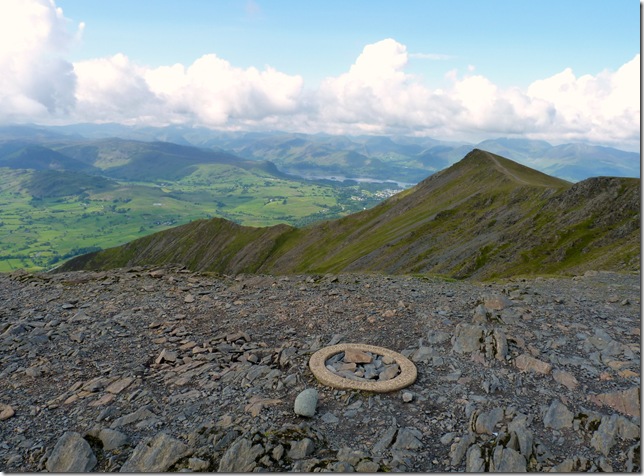 Blencathra’s Ordnance Survey Ring in oppose to the usual pillar trig point, I will look in the use of the circular brass ring a little more as this does interest me, in the background is the Halls Fell ridge. |
