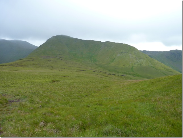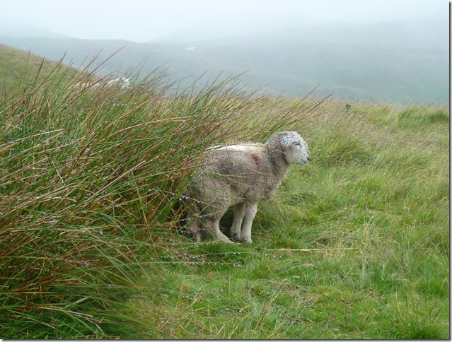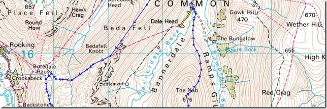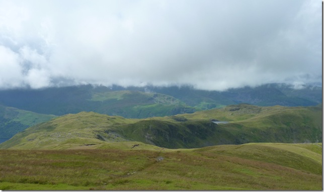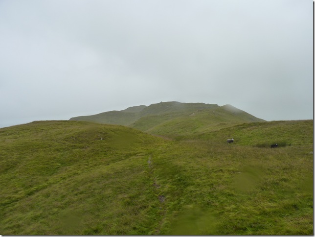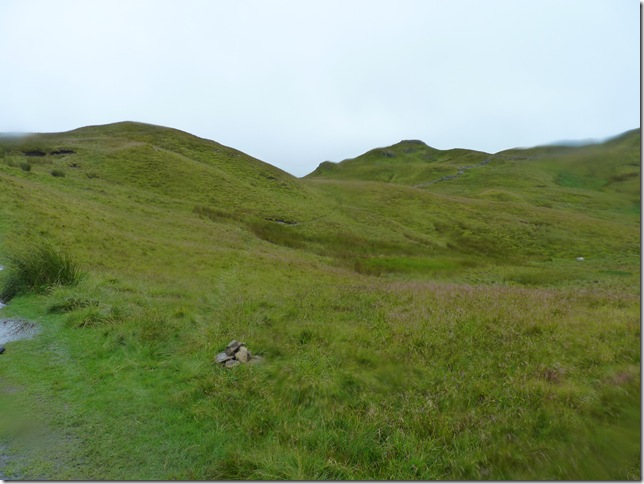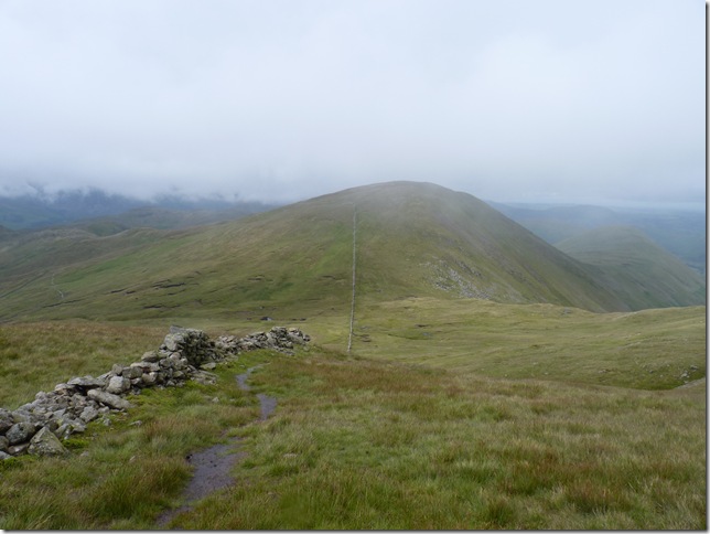 Beda Fell summit with Steel Fell (Pikawassa) behind, spirits were high although by now the two of us looked like drowned rats & the mention of ‘nothing is totally waterproof came to mind’ we squelched on along the ridge & followed the path down to Boredale Hause. |
