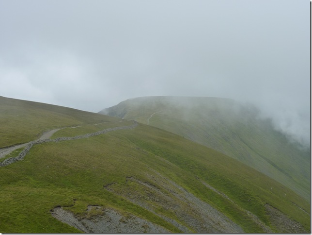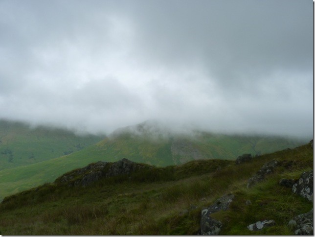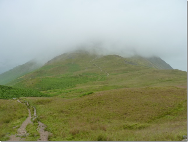 In better conditions this, our last would be fell of the day would dominate our views to the left & into the Martindale Valley. The Nab holds an altitude of 576 meters & this picture shows just how low the cloud is. |