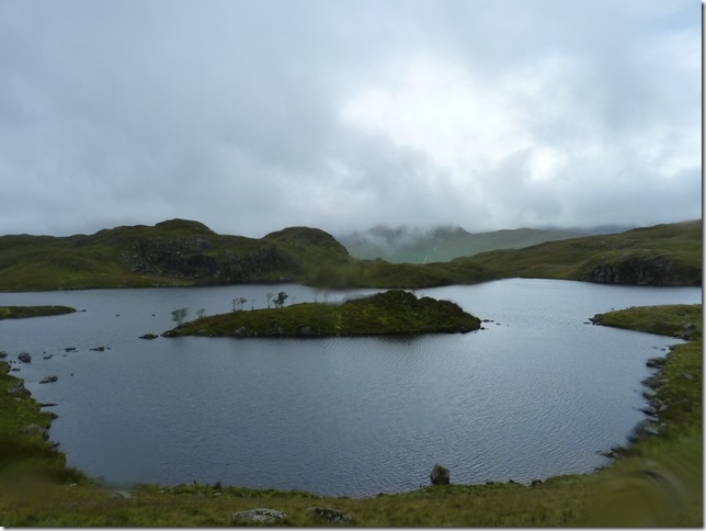 Angle Tarn, with our next summit behind, Brock Crags, the path around Angle Tarn was flooded so we took to high ground for much of its circumference. |