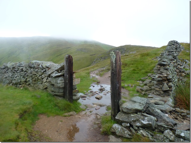 Still taking a soaking as we head through the landmark gatepost at Satura Crag, we’d just met a couple up from London walking the Coast to Coast in four separate segments, this the second segment of there tour from Grasmere to Bampton, they had travelled up from London the day before, we wished them well before we headed off for The Knott. |