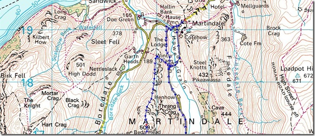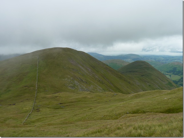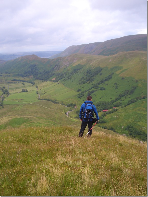 Leaving The Nab & heading down into the Bannerdale valley, it was a pretty difficult descent from the summit, Tim took a faint path flanking the ‘nose’ of The Nab, me I went for a zig-zag descent through the long grassy slopes & heather patches, we both met up at the stone wall you see in the foreground, Hallin Fell is the small fell you see at the head of the valley a whole 2.6 miles away. |
