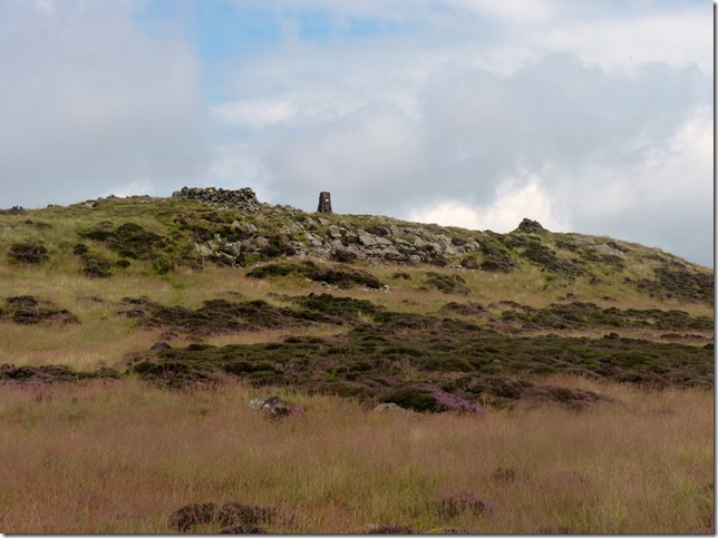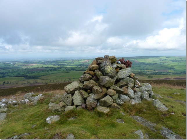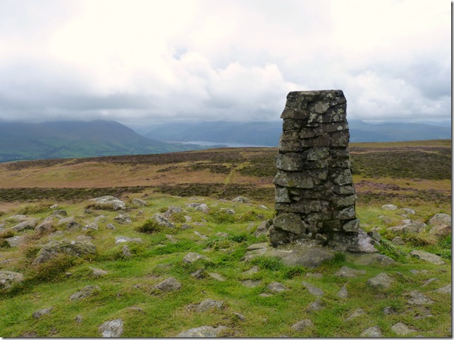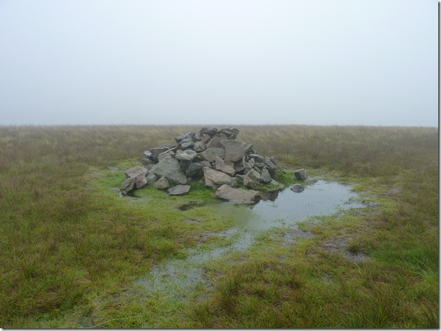 With a little respite from the rain I take time to wipe the camera lens with a wet lens cloth & take this shot of the main summit cairn on Great Sca Fell. |