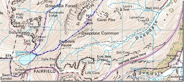 Ahead we have Fairfield to the left with Seat Sandal Taking centre & a glimpse of Dollywagon Pike’s Falcon Crag to the right. |