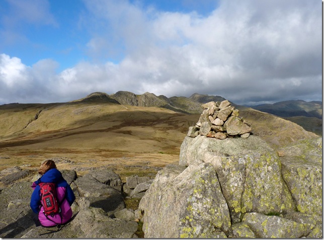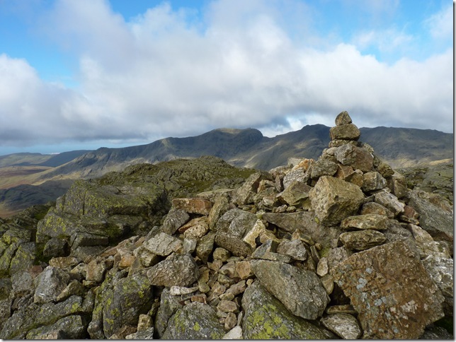 Cold Pike summit cairn looking towards Crinkle Crags & Bow Fell.