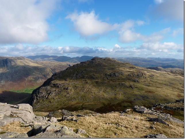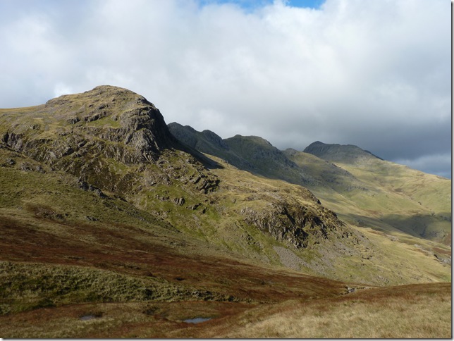 Looking over to my descent route with the southern flanks of Pike O’ Blisco (L) Browney Gill & Great Knott (R) the Fell in the centre is my last Fell of the day Cold Pike. |