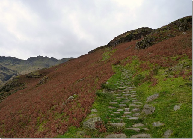 I’m not happy, it has started to rain & the path here is steep & the rock underfoot, slippery, I mumble, I groan to myself, I’m going to bloody slip, with every step I take I trust my footings first, its a slow descent & for anyone who has walked up the valley from Oxendale-Red Tarn bound they will know exactly what I mean.