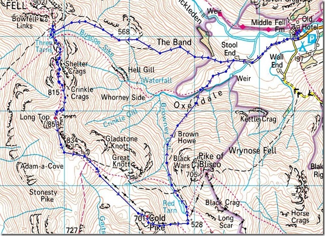 Old Dungeon Ghyl, Stool End Farm The Band Three Tarns Crinkle Crags Long Top Cold Pike Red Tarn Oxendale Old Dungeon Ghyl |