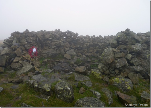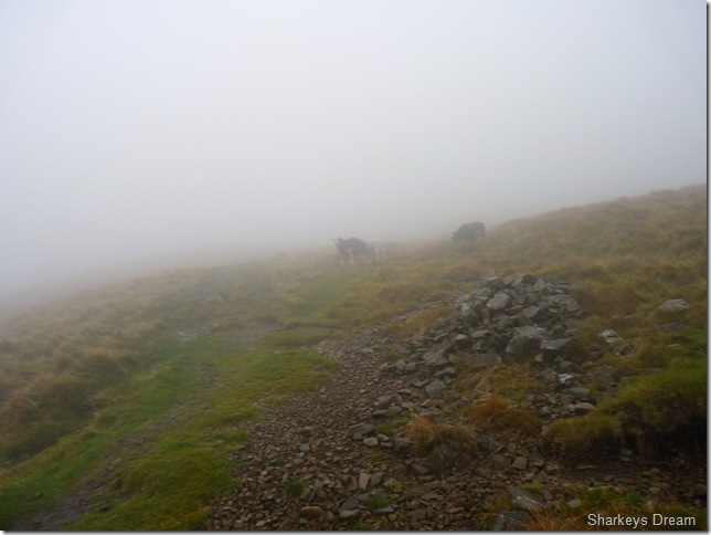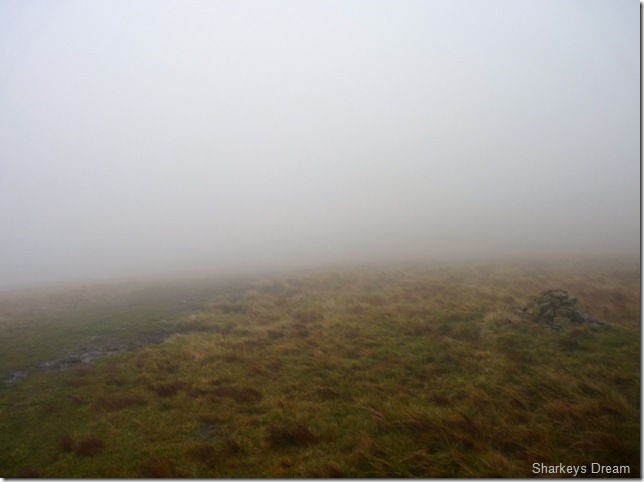 Not long after taking this photo I hear voices in the cloud, I cant see them but I hear them, I’m half expecting some ghostly like figure to appear through the cloud, wind & the rain, & then it draws silent again, surely I didn’t just make the voices up in my head, I mean, it wouldn’t be un-heard of! then through the cloud I hear a shout “come here, come here” I spot a Chocolate Labrador charging at me “come here Sampson!! get here, down” by now Sampson & I where more than acquainted as he jumped up at me with this “I’m gonna slather that face look” etched into his eyes, Then out of the cloud I spot Sampsons owners, A father & his two sons, all upto their necks in waterproofs, “its just us stupid enough is it” I quipped, he looked a lot more serious than Sampson did, “I shouldn’t of come out today” its just not nice is it” I spot a Garmin GPS much like mine hooked to his chest strap & I think “at least you have the comfort of your GPS & your boys are save, not much older than my own son of 11yrs” we Speak in terms of when the wind was low enough for conversation, his boys, maps hooked around there necks are quiet & listen to the conversation, its much the same & all about the weather, he asked me my route & I his, we are both doing the same route in reverse of one another, except as I’m trying to stop Sampson licking the hell out of me & mudding my Rab Latock Jacket he quips, I’m going to make to Whin Rigg & come back the same way, well, I say your about twenty minutes away in that direction, enjoy your walk as I smile & start to walk away, I grab my camera to take their picture walking in the cloud but they have already disappeared. |