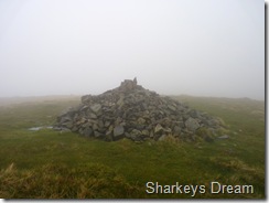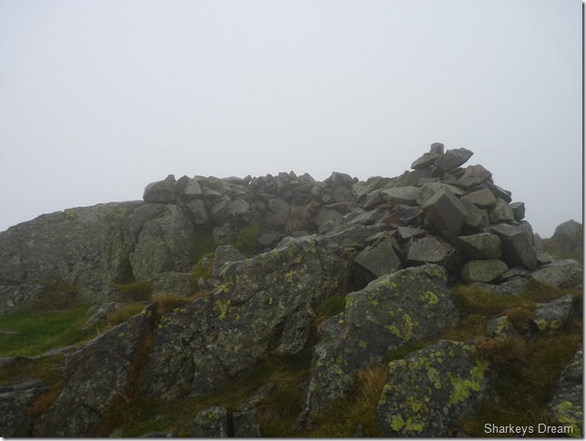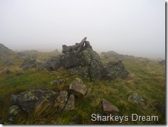 I didn’t hang around the summit to long at all, the wind was at its strongest here so for the first time this year, I take off my pack & take out my beanie & gloves, reminiscence of a winter Lakeland quickly came flooding back as I squeezed my wet red-raw hands into my technical Extremities Wind Stopper gloves, I donned the Beanie, & again fastened down the pull strings on my hood & headed back into the cloud. |