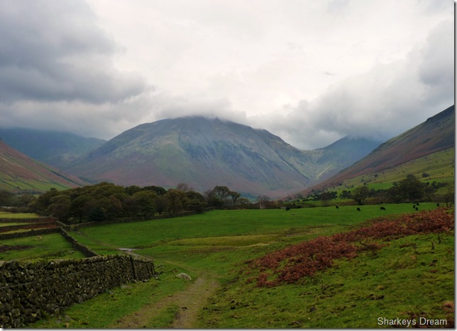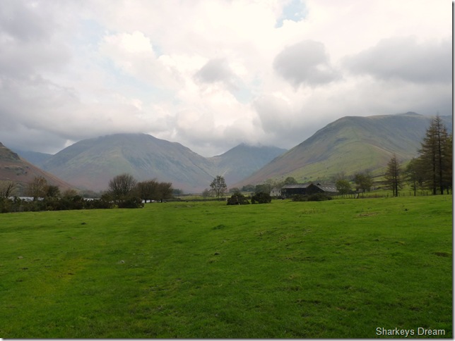 Looking back at Wasdale Head Hall Farm, Kirk Fell, Great Gable & Lingmell.