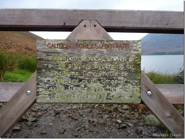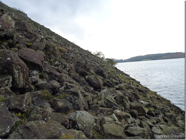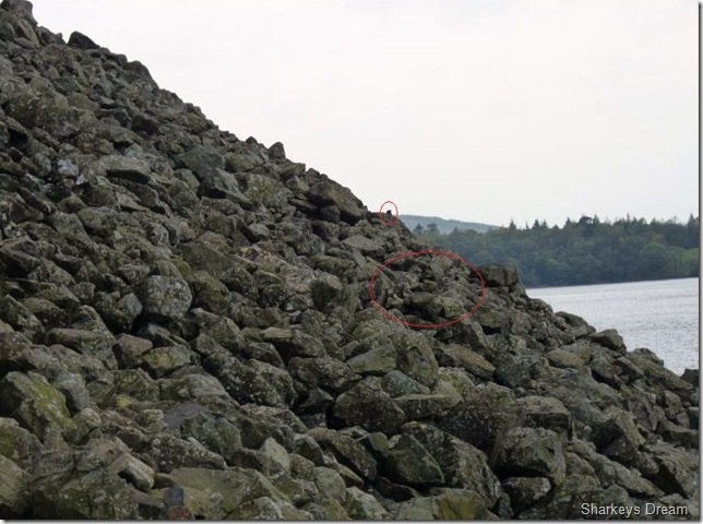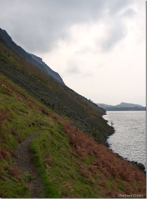 The cairns were few & far between, they kept a constant altitude around about 30 feet above the water line, & although they look difficult to see in the picture, once on the Scree slope & your eyes have adjusted to the contours of the fell side they stick out quite prominently. |