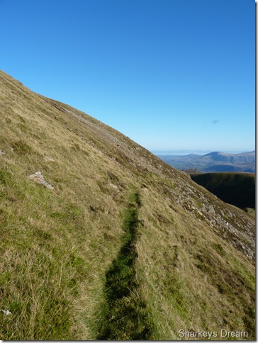 Instead of keeping to the main path I follow this narrow ledge for about 200 yards, this lead me to believe that I had out-flanked the summit which indeed you will if you decide not to turn left & up a grassy slope popping out right at the side of the main path. |