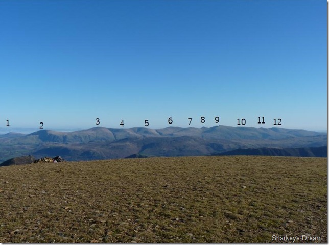 1 Great Mell Fell, 2 Clough Head, 3 Great Dodd, 4 Watsons Dodd, 5 Stybarrow Dodd, 6 Raise, 7 White Side, 8 Catstycam, 9 Helvellyn, 10 Nethermost Pike, 11 Dollywagon Pike, 12 Fairfield. |