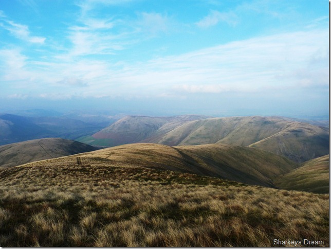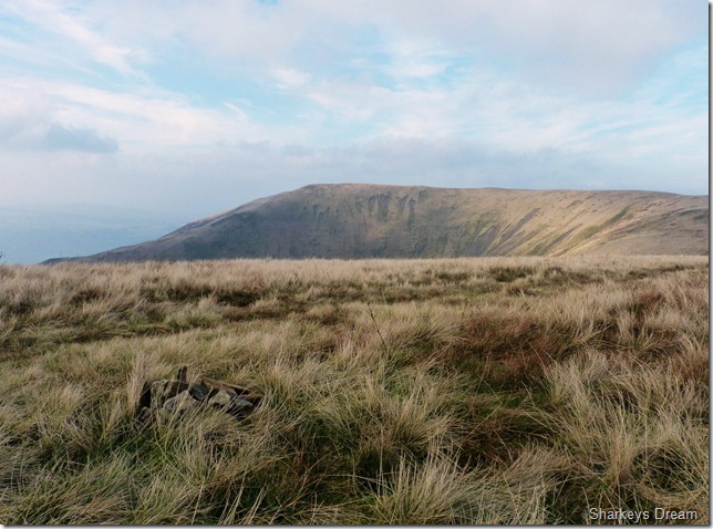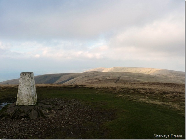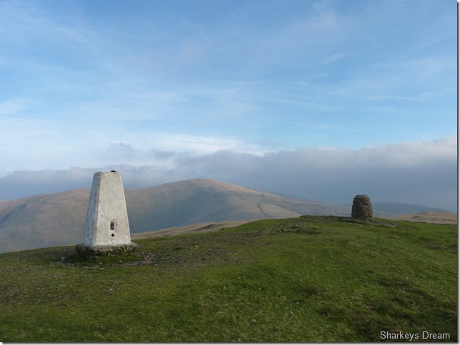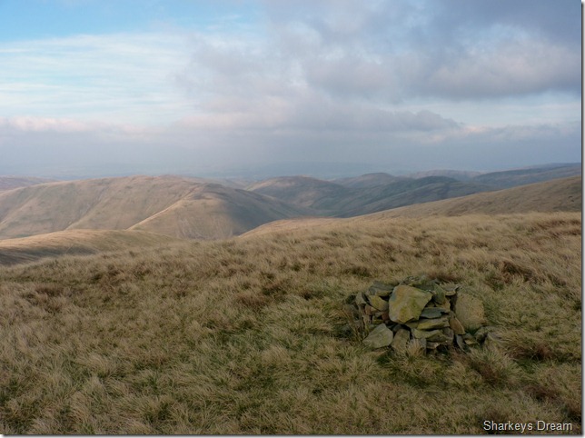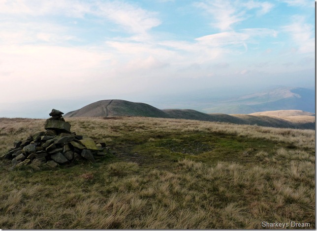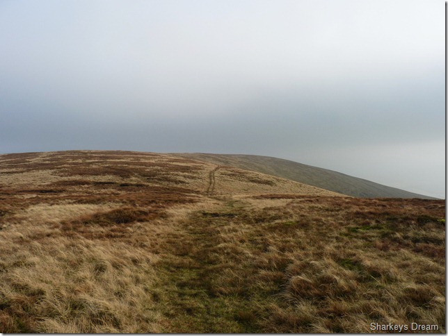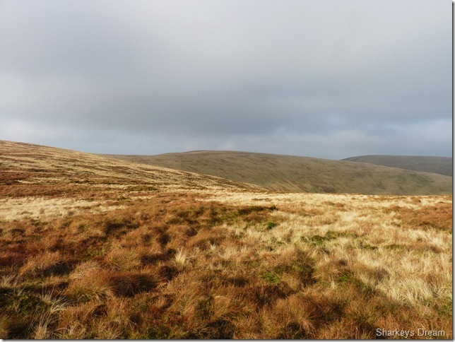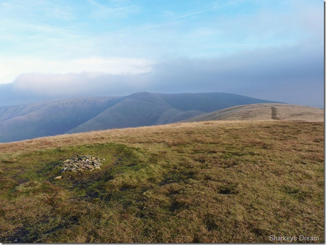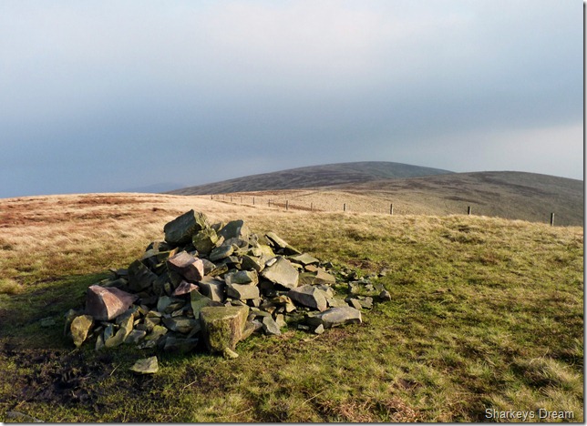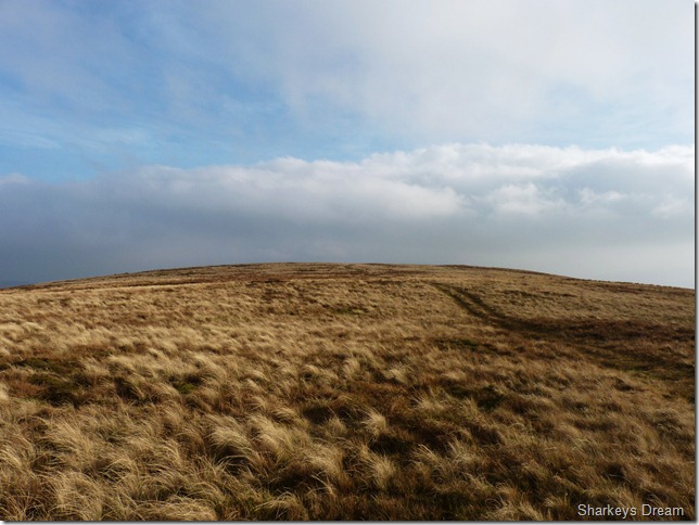 It was a lovely stroll across grassland to reach the summit, here I am still being buffered by gales but not to the extent as I was while I crossed Rowantree Grains. |