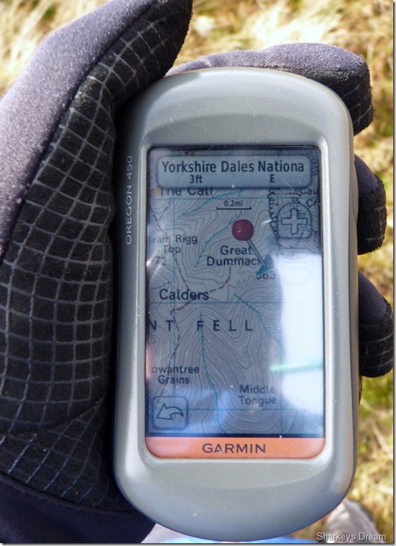 I follow a track carefully from the summit cairn at Calders seen in the photograph, for some reason I keep to the right when if you look carefully you can see the path splitting left & right, I’ as always stick to the more obvious path which I found to be the right, yet this path out-flanks the summit if not, by-passes the summit altogether. I have the GPS in hand as I follow my marker to within 3ft of the Ordnance Summit point, it is here I claim Great Dummacks summit while perched upon a clump of heather. |