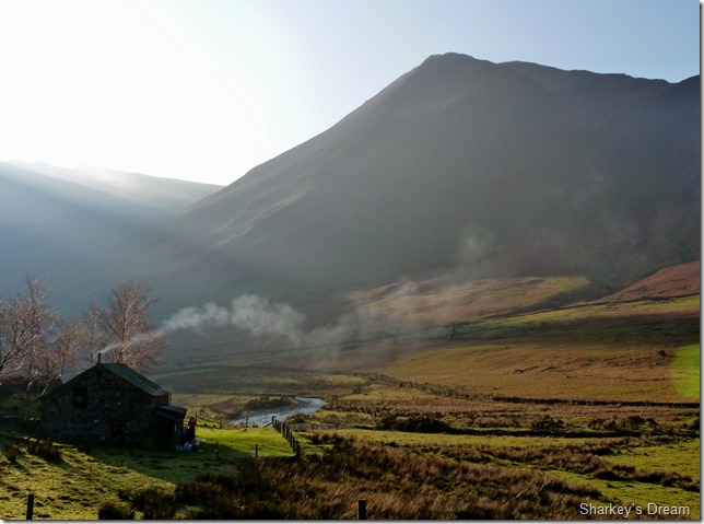 Passing Climbers Cottage (now a holiday retreat) with a Hindscarth backdrop. |