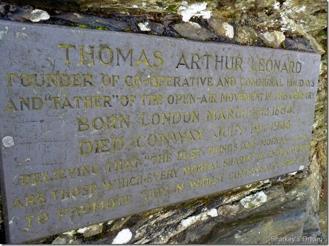 There’s a little scramble to be had at this point, where here you will find this plaque commemorating Thomas Arthur Leonard, one of the founders of co-operative and communal holidays. |