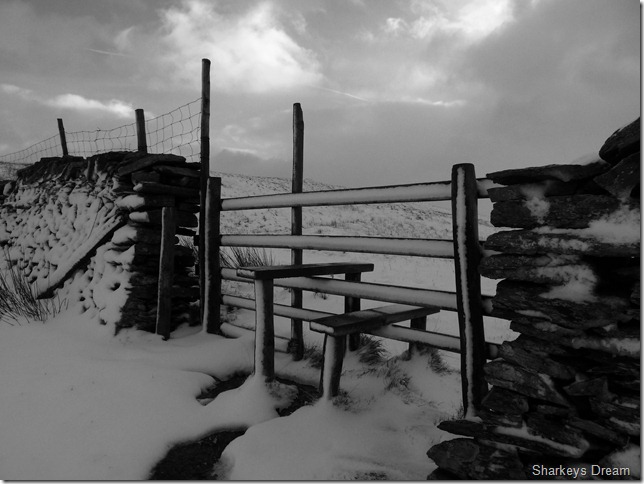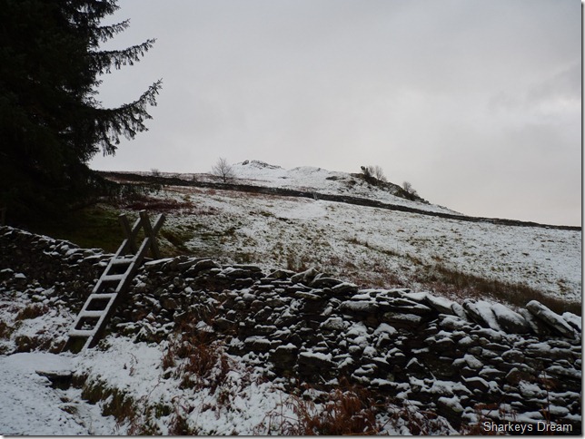 We follow the wall to this gap & this sty, here the path crosses from left to right and then from here its just a short walk to the summit of Sallows. |