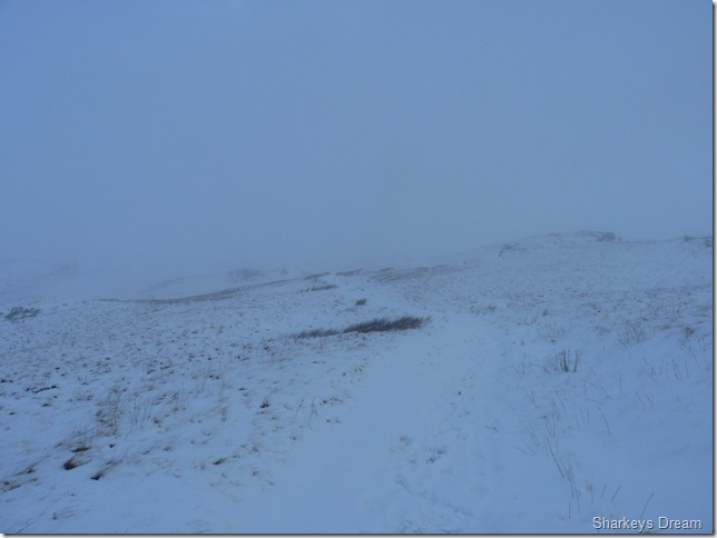 With strictly limited views safety now becomes paramount, just to the right of the picture is the edge & some very dangerous snow cornice, the first of many we would see today, I check our position & momentarily as more of a comfort more than anything. The snow is deep along the path sometimes up to four feet in places as I later found out… It would be much easier to walk along the grassy tussocks seen on the right but way to dangerous, here I am reminded of my ascent on Ben Nevis over three years ago & the white out we faced that day, I “step out the box” as I stride through the deep snow & remind myself, even though I cannot see any of my surroundings I know exactly where I am, consciously I pick out Sallows behind me, Troutbeck to my left & Kentmere Pike to my right, this small exercise is great brain fodder & keeps my mind active of my otherwise vacant surroundings. |