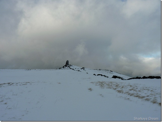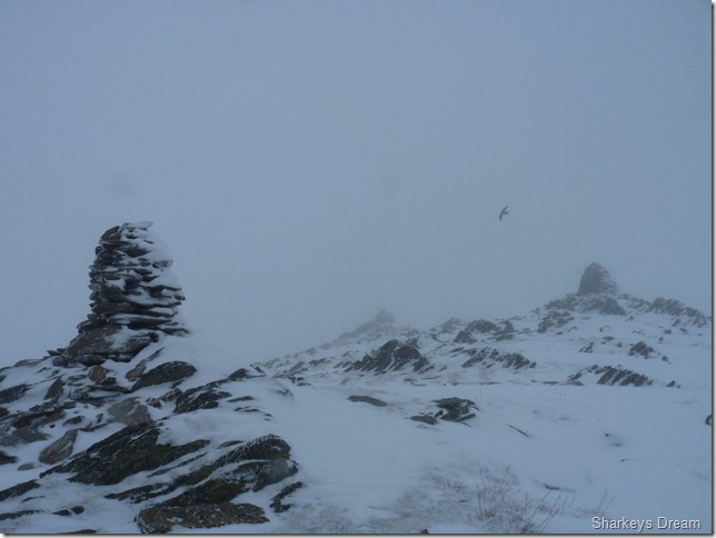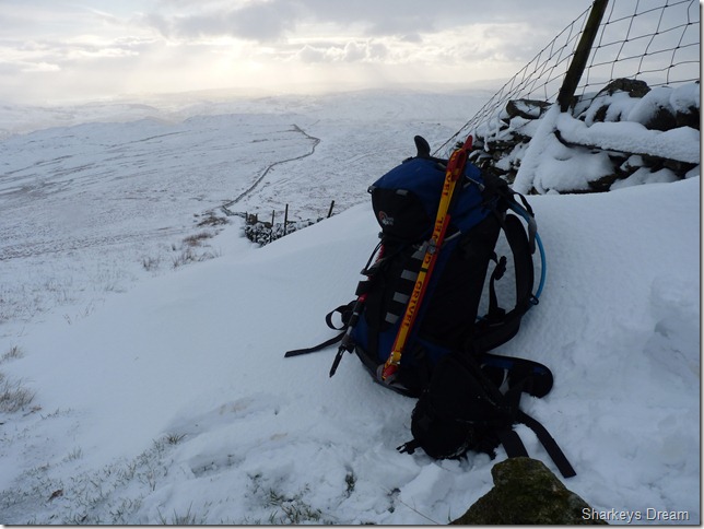 We ditch the packs just above half way & take a small rest on the other side of stone wall out of the wind, Tim cracks open a boiled egg, while I sit crossed legged on a small rock trying to keep my bum out the snow! |