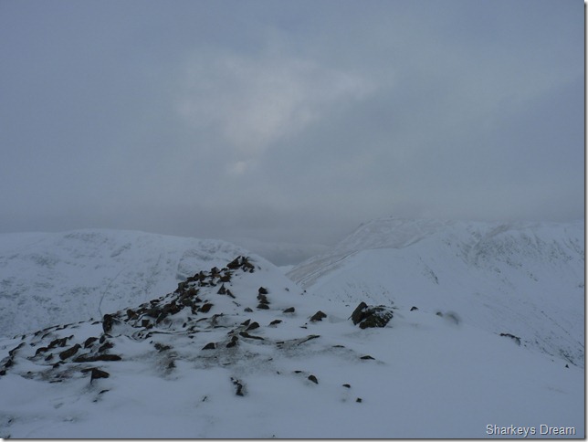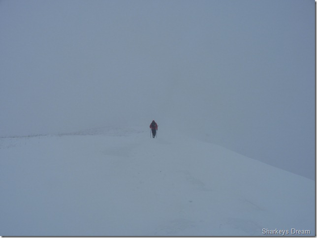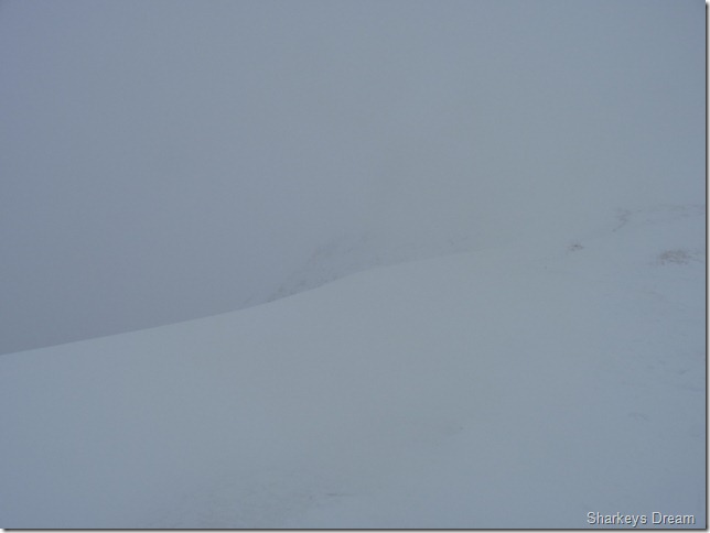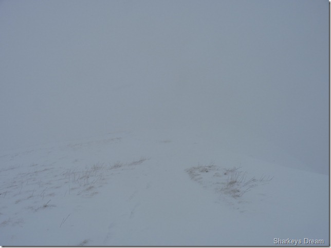 We’ve not long been on the pass & we were still quite a considerable way of Yoke’s summit when the cloud came down on us, the cloud seemed to wait for us to join the pass & noticeably at the same time, the wind got stronger & the chill got colder. |
