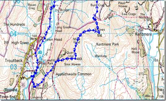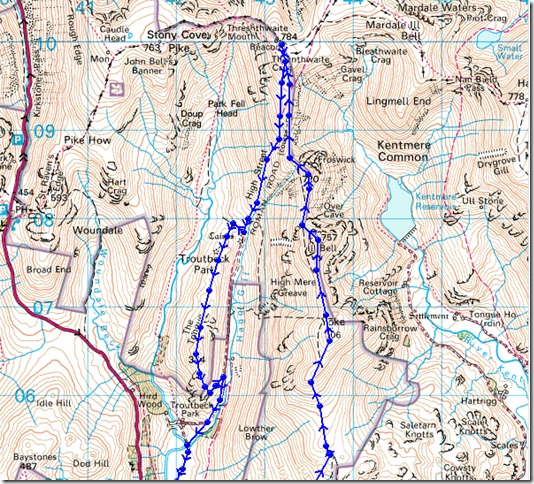 Troutbeck Church – Garburn Road – Sour Howes – Garburn Nook – Garburn Pass – Yoke – Ill Bell – Froswick – Thresthwaite Mouth – Troutbeck Tongue – Ings Lane – Truss Lane – Troutbeck Church |