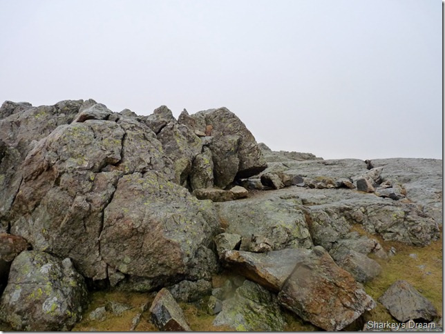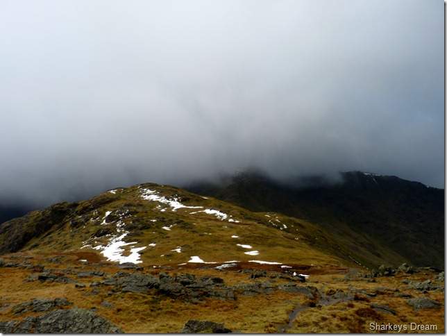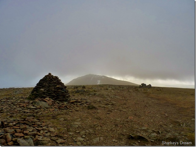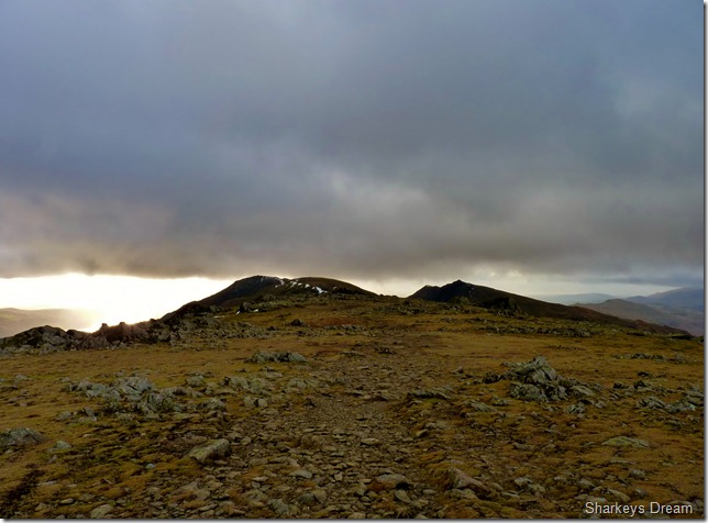 I sit out the gust & driving rain perched on the rock you see, I am thankful to be out of that gale, If anyone who has walked with me can vouch at the fact that I normally walk past a summit with only a photo in mind then this might give you the affects the storm & winds were having on me right about here, I even think about calling it a day but then this happens… |