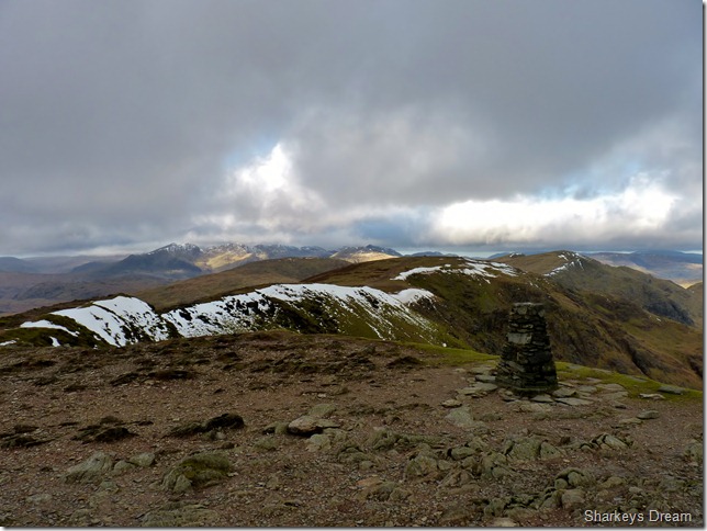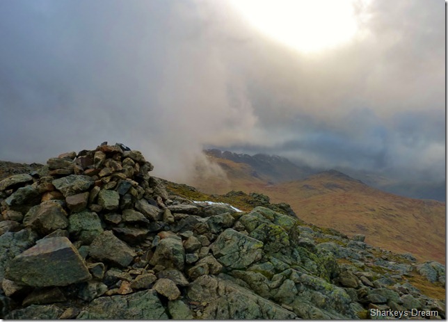Brief views over towards Bow Fell & Crinkle Crags from the summit cairn.
