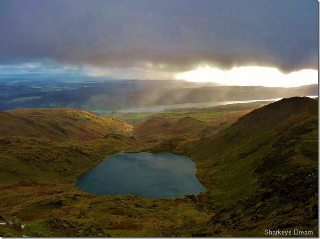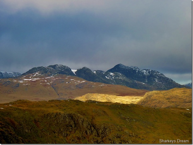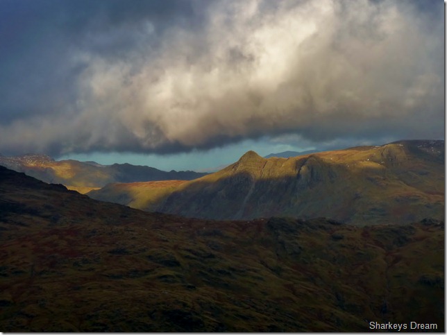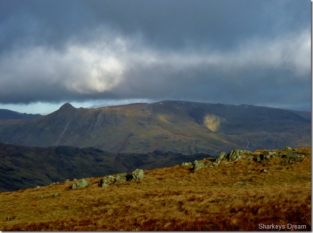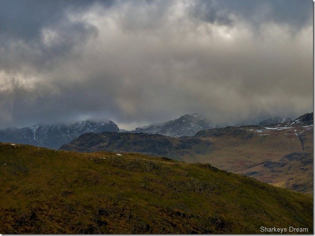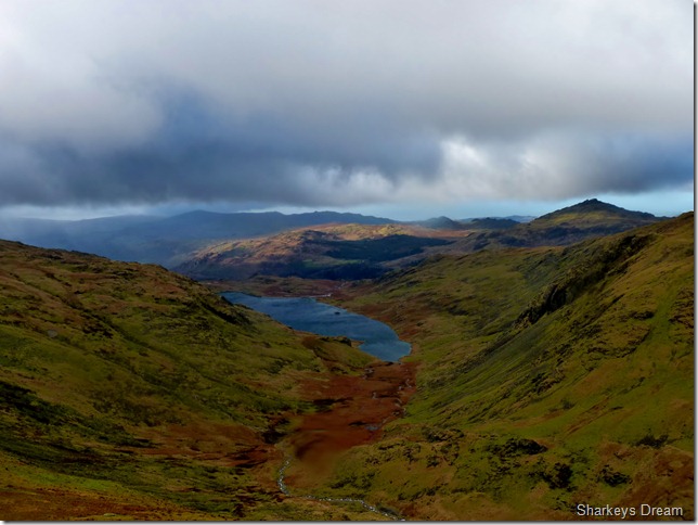 During a brief rain spell I wander over to the opposite side of the ridge to get this shot of Seathwaite Tarn & Harter Fell upper right.