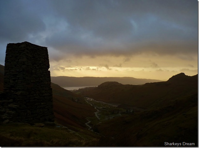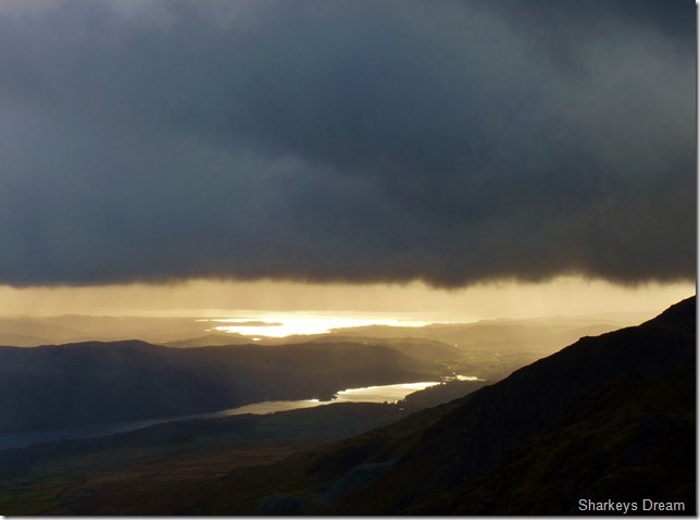 Looking back at a glimpse of Coniston Water & The Bell (R) as the sun still rises. |