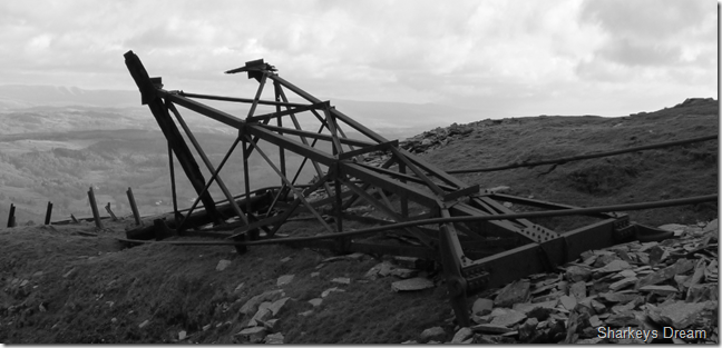 Remains of a crippled rusting steel tower that once conveyed trucks full of Copper Ore between the top & bottom of the Mountain side. |
