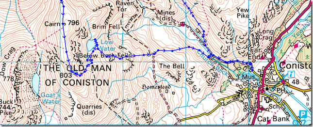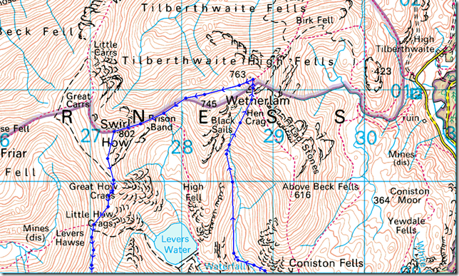 Silver Bank – Miners Bridge – Coppermines Valley – Red Gill – Red Gill Head Moss – Wetherlam – Prison Band – Swirl Hawse – Swirl How – Brim Fell Rake – Brim Fell – The Old Man Of Coniston – Low Water – Boulder Valley – Miners Bridge – Silver Bank |