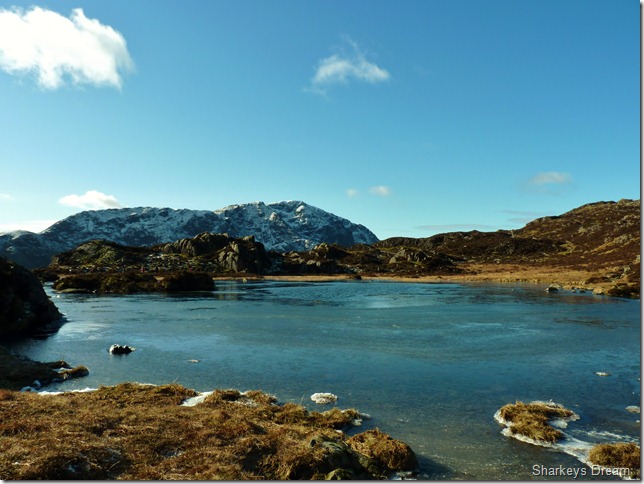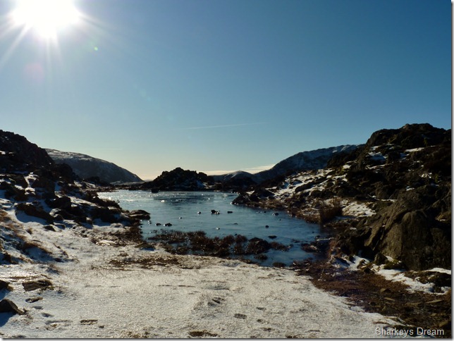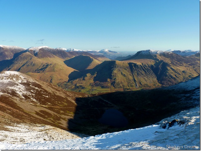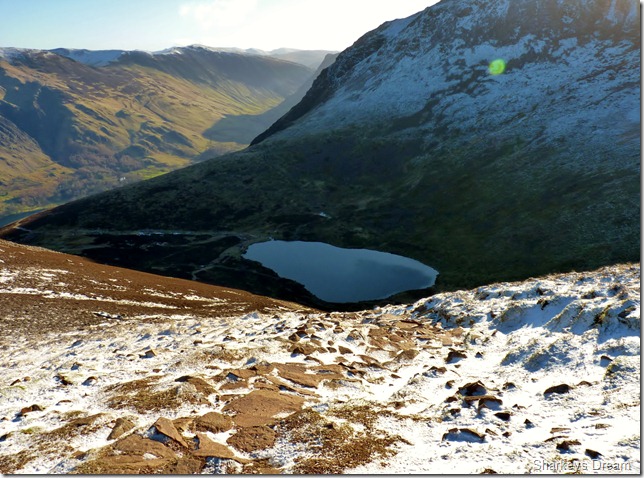 Looking down on Bleaberry Tarn as I hit a light dusting of fresh snow.