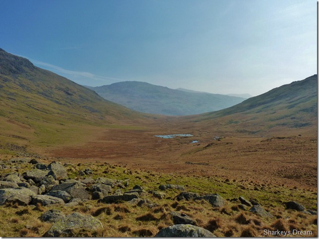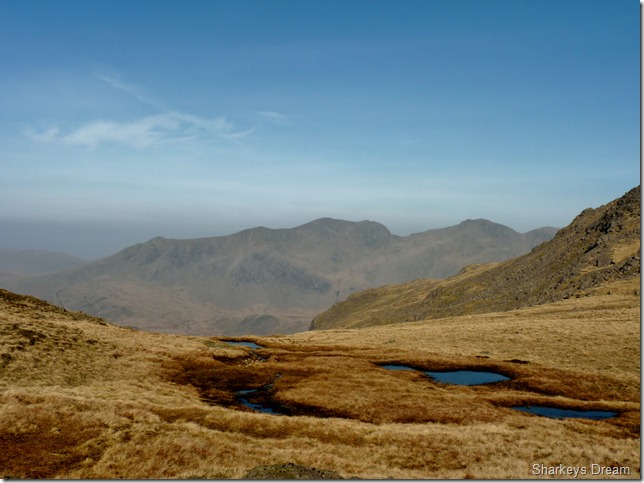 Bow Fell & Three almost dried up Tarns as I prepare to descend Shelter Crags.